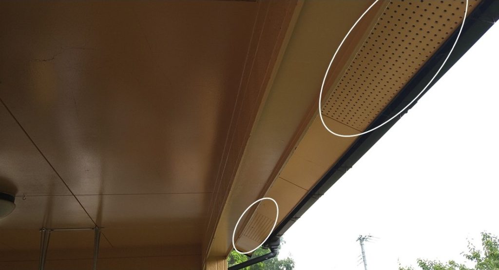 我が家は壁上部に設置されたガラリと有孔ボードを使った軒天(軒裏)換気の併用で屋根裏の換気を行っています。